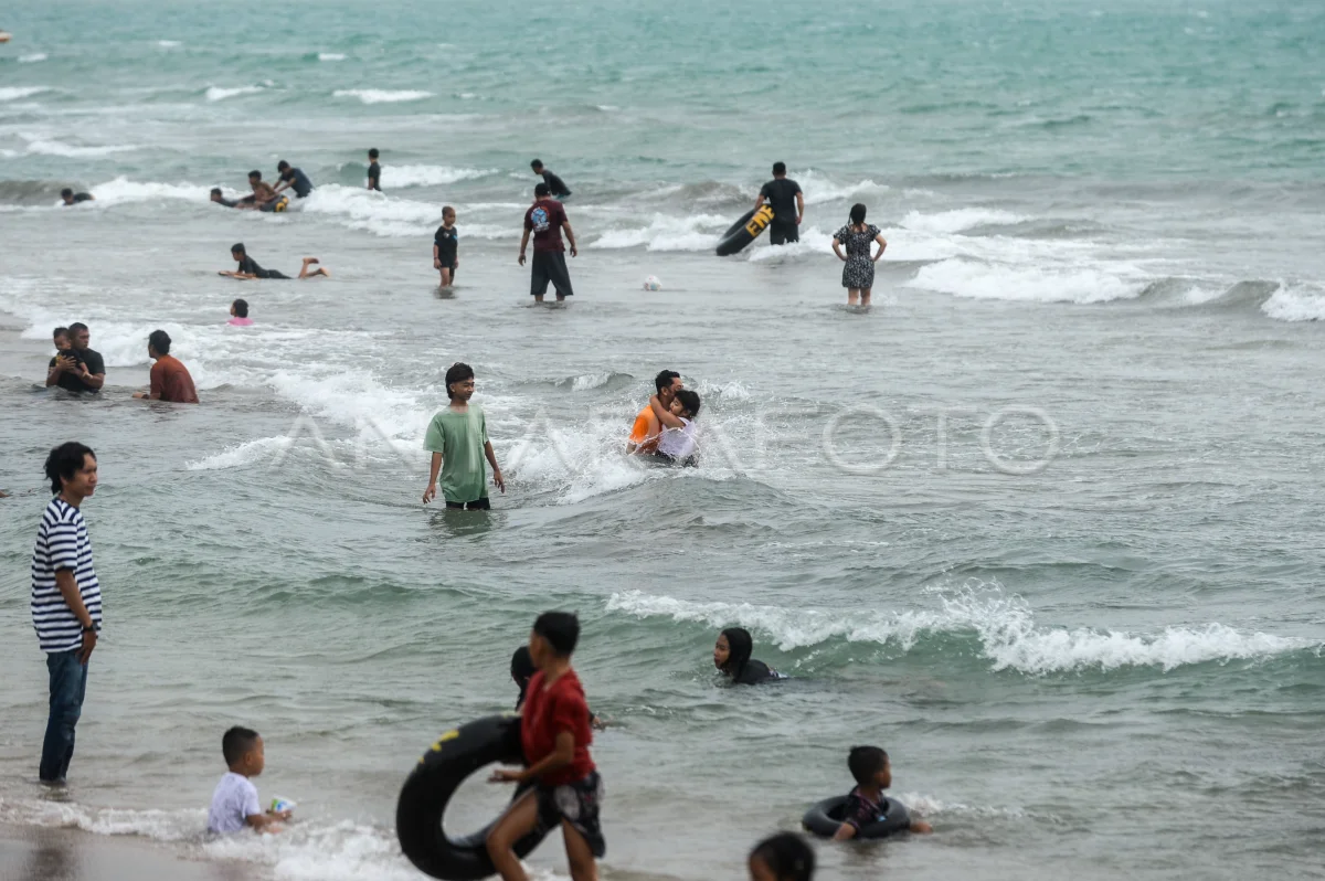 Sejumlah wisatawan bermain air di Pantai Anyer, Kabupaten Serang, Banten, Selasa (1/4/2025). Badan Meteorologi, Klimatologi dan Geofisika (BMKG) mengeluarkan peringatan dini untuk mewaspadai gelombang tinggi laut Banten berpotensi mencapai 1,25 hingga 2,5 meter yang meliputi perairan Selat Sunda di sepanjang Pantai Anyer, Carita, dan Tanjung Lesung selama libur Lebaran 2025. ANTARA FOTO/Muhammad Bagus Khoirunas/nym.
