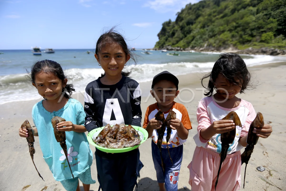 Sejumlah bocah menunjukkan cumi segar dari nelayan di Desa Langgula, Kabupaten Gorontalo, Gorontalo, Sabtu (13/9/2025). Langgula diberi nama Kampung Cumi karena menjadi desa pemasok cumi segar di wilayah Gorontalo dan memiliki 100 nelayan aktif bahkan telah menyelenggarakan Festival Sejuta Cumi sejak tahun 2022. ANTARA FOTO/Adiwinata Solihin/YU