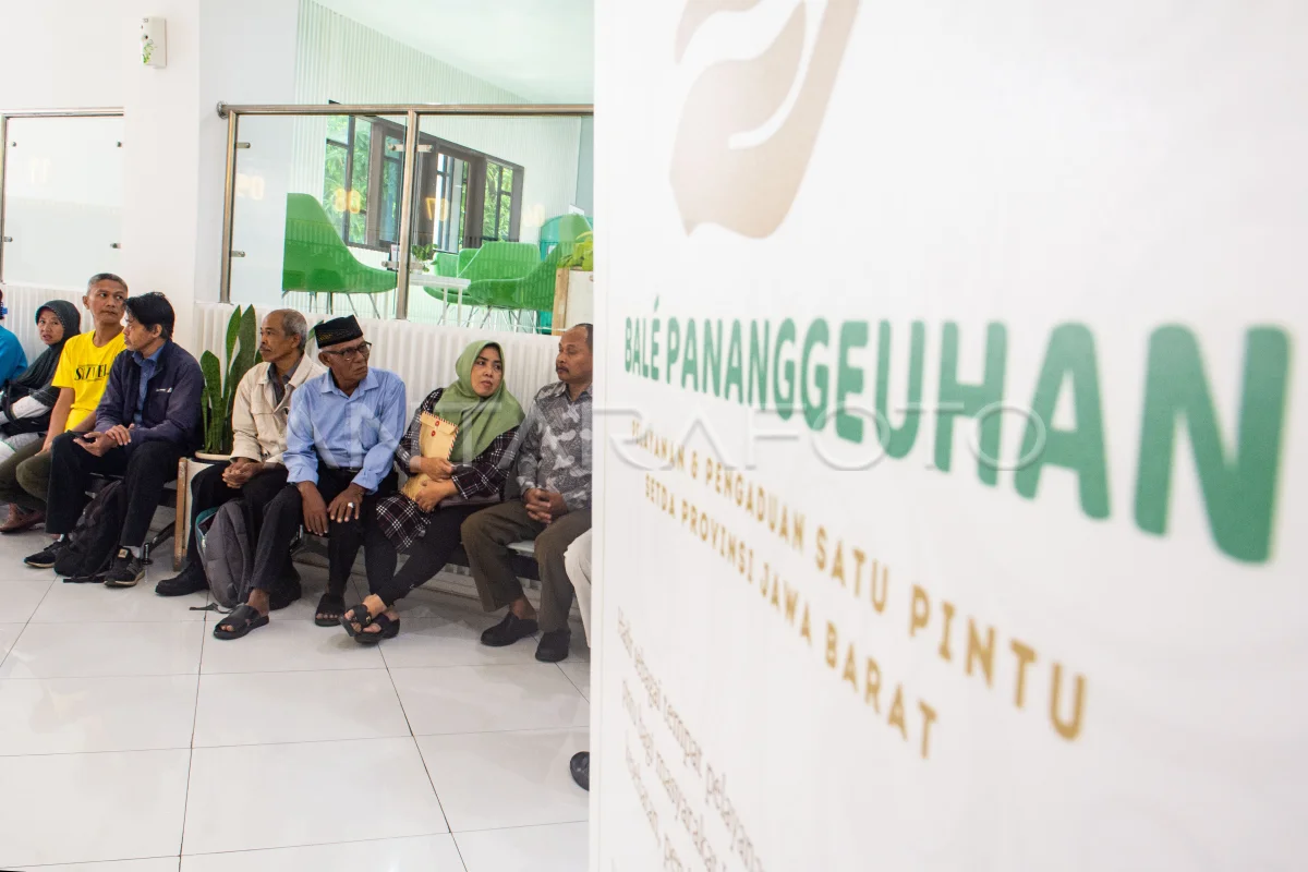 Warga antre untuk mendapatkan pelayanan pengaduan di pos pengaduan masyarakat Bale Pananggeuhan, Gedung Sate, Bandung, Jawa Barat, Senin (6/10/2025). Pemprov Jawa Barat resmi membuka pos pengaduan bagi masyarakat umum di Jawa Barat dengan fokus pada persoalan kesehatan, pendidikan, dan bantuan hukum sebagai bentuk pelayanan secara langsung, humanis, serta responsif. ANTARA FOTO/Novrian Arbi