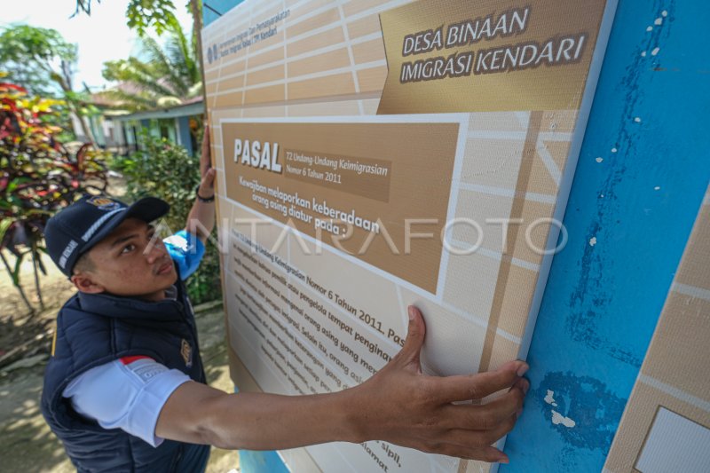 Petugas Imigrasi Village Construction (Pimpasa) installs a board of liability announcements reported the presence of foreigners in Rumbia Village Hall, Konawe Regency, Southeast Sulawesi.