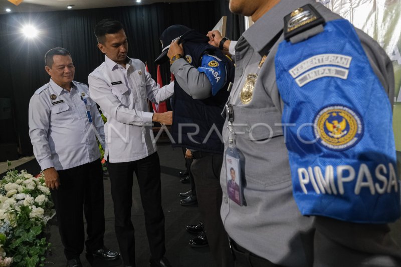 The People of Village Construction Immigration Officer (Pimpasa) install badges on his arm before serving at the I TPI Kendari Class Immigration Office, Kendari, Southeast Sulawesi.