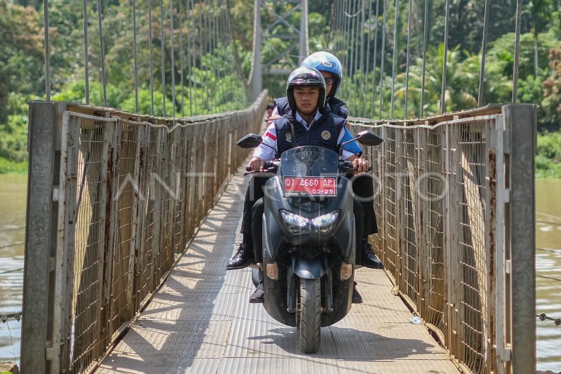 Petugas Immigration Village Construction (Pimpasa) riding a motorcycle through a hanging bridge when heading to the village of the bin in the village of Laosu, Konawe Regency, Southeast Sulawesi.