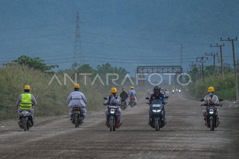 Petugas Immigration Village Construction (Pimpasa) riding a motorcycle (second right) between a number of smelter factory workers in Morosi District, Konawe Regency, Southeast Sulawesi.